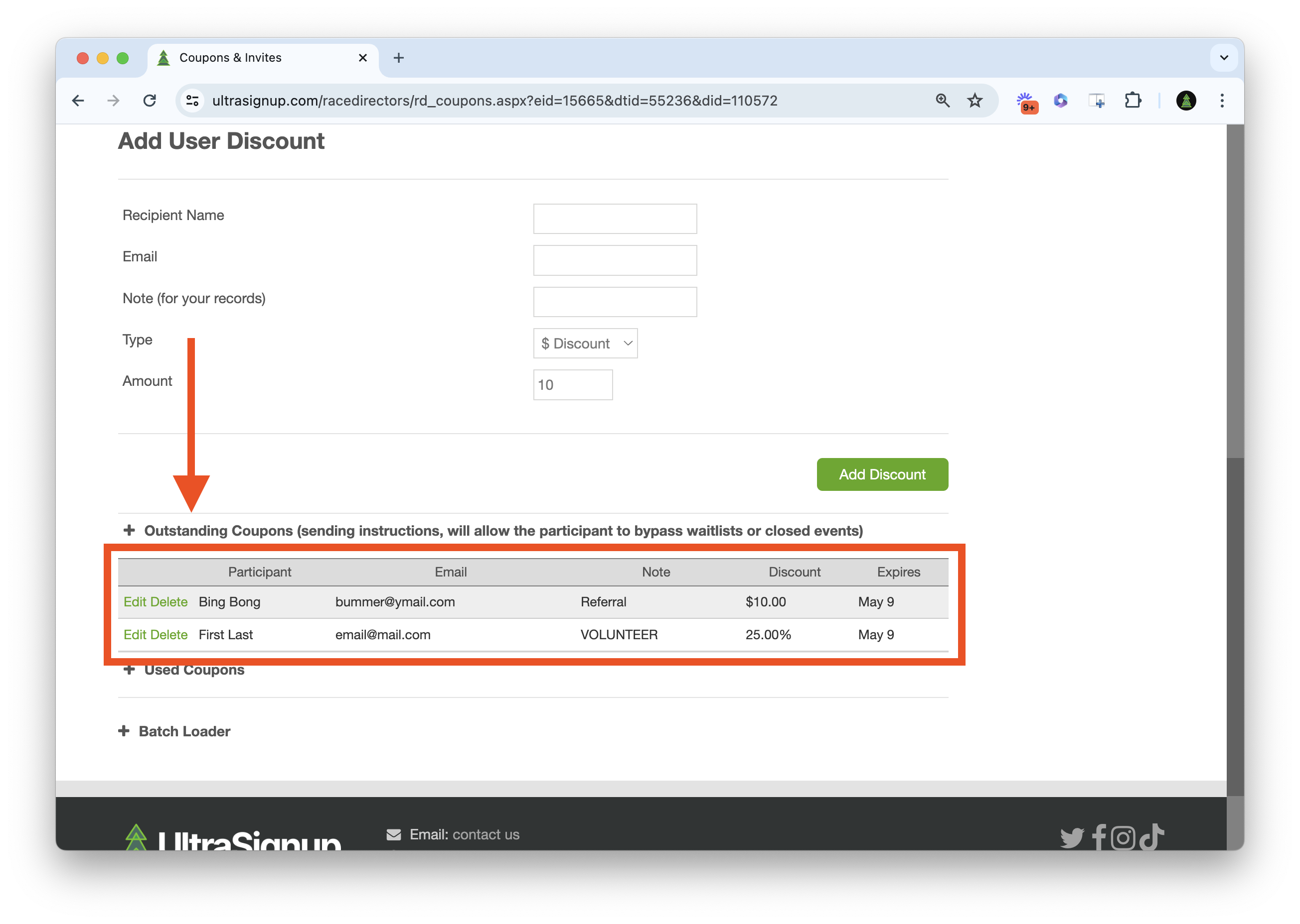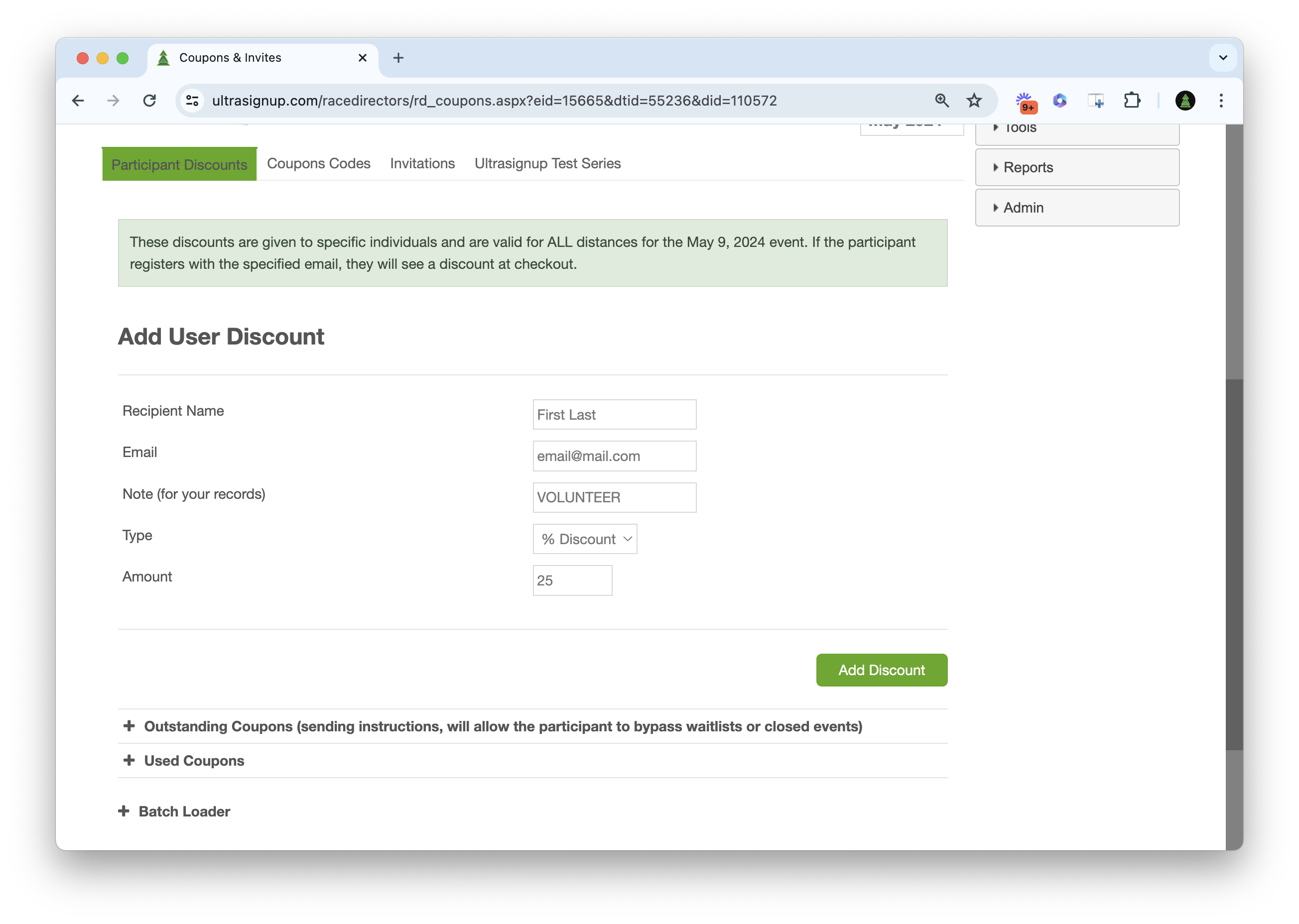 Participant discounts are assigned to specific individuals and are applicable to specified distances in your event. When a participant registers using the designated email, they will see the discount applied during checkout.