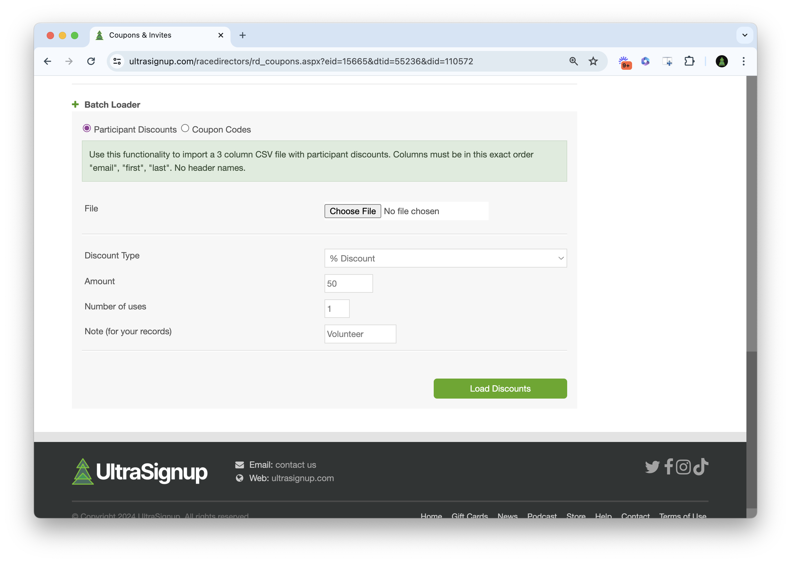 Fill in all discount information, upload your file, and then click Load Discounts