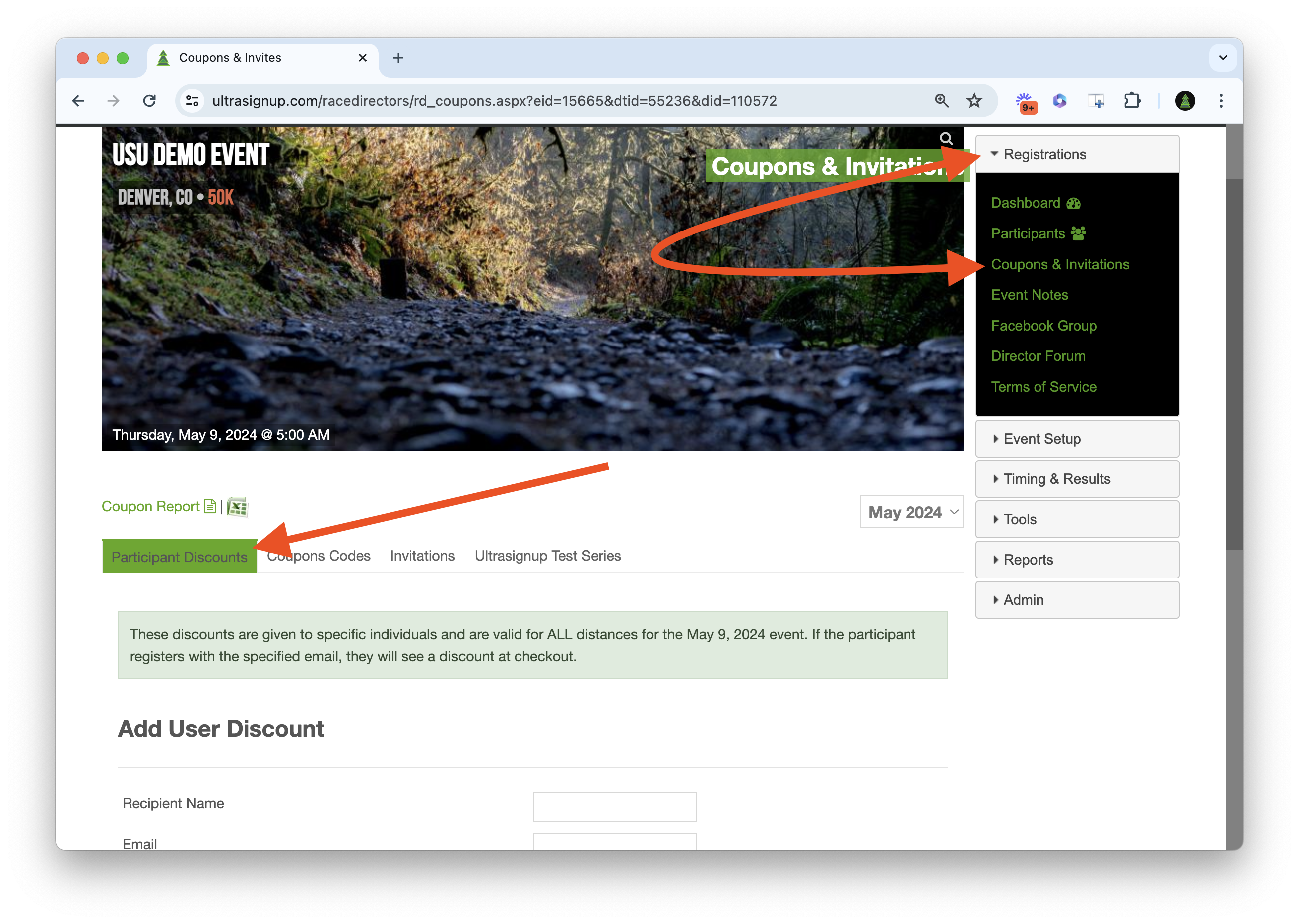 Event page Registrations Coupons & Invitations Participant Discounts