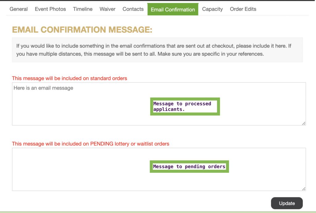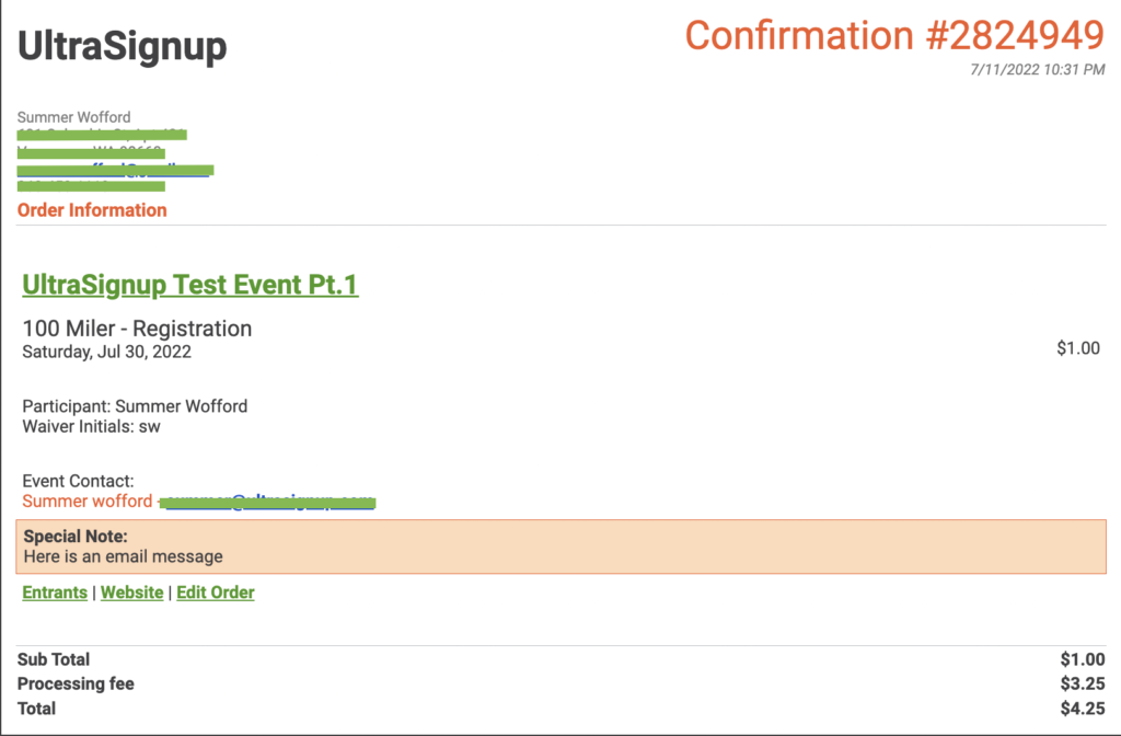 You can add a special note to your confirmation by navigating to your admin tools. Click event setup edit event email confirmation.