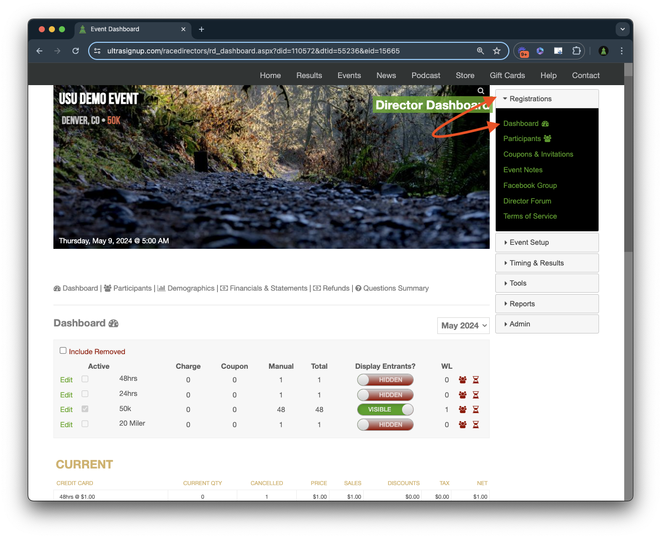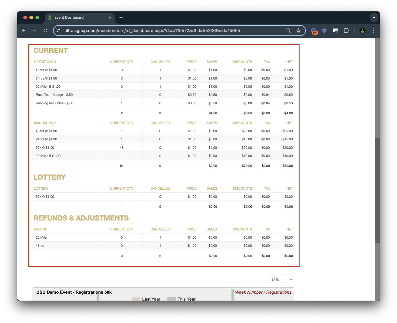 Your event dashboard offers a plethora of useful tools. Here, you can manage your entrant lists by hiding or displaying them, deactivate distances, and view various breakdowns of your registrants, including by distance, number of charged entrants, coupon entries, manual entries, and total waitlisted participants. Additionally, you can track current funds to be paid out and navigate back to previous years to compare data. At the bottom of the dashboard, a graph compares your current registrations to those of the previous year, if available. It's a comprehensive page packed with valuable information.