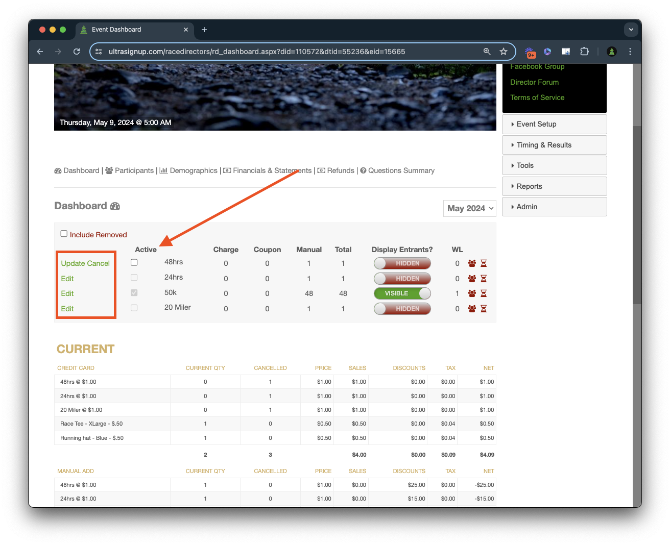 Display/Hide Your Entrants: To make your entrant list public, slide the toggle next to the distance to Visible (green). To hide the list, slide it to Hidden (red).