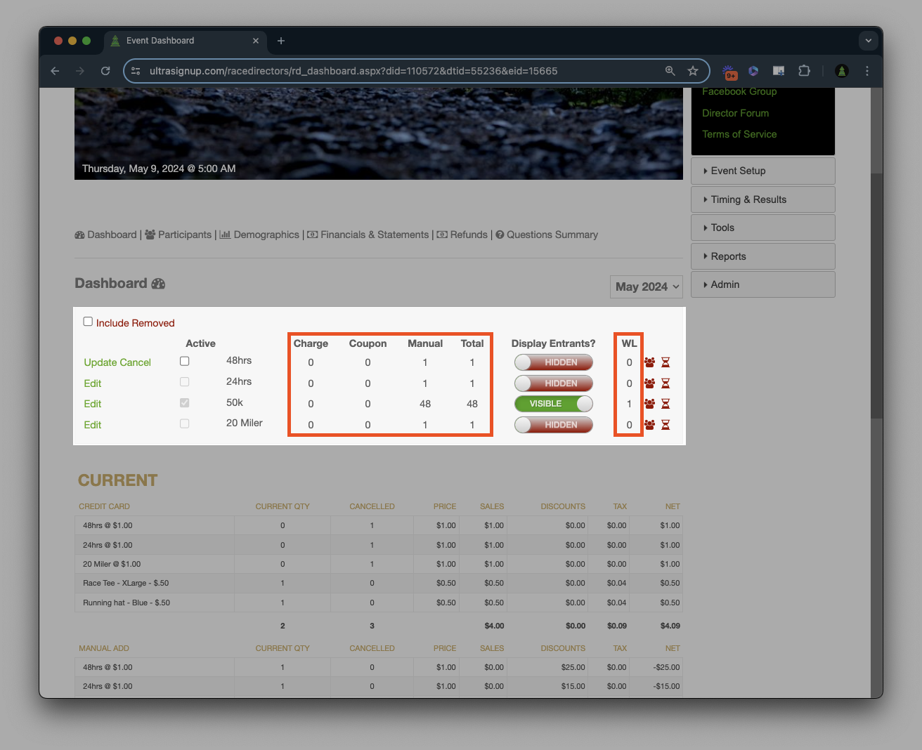 Participant Count Breakdown: Charge: Shows the number of participants charged for registrations. Coupon: Indicates the number of participants who registered using a 100% coupon. This count excludes those who used partial credit or coupon. Manual: Reflects the number of participants manually added to the event by the Race Director. Total: Represents the overall count of participants, combining charged, coupon, and manual entries. Waitlist: Displays the number of participants currently on the waitlist.