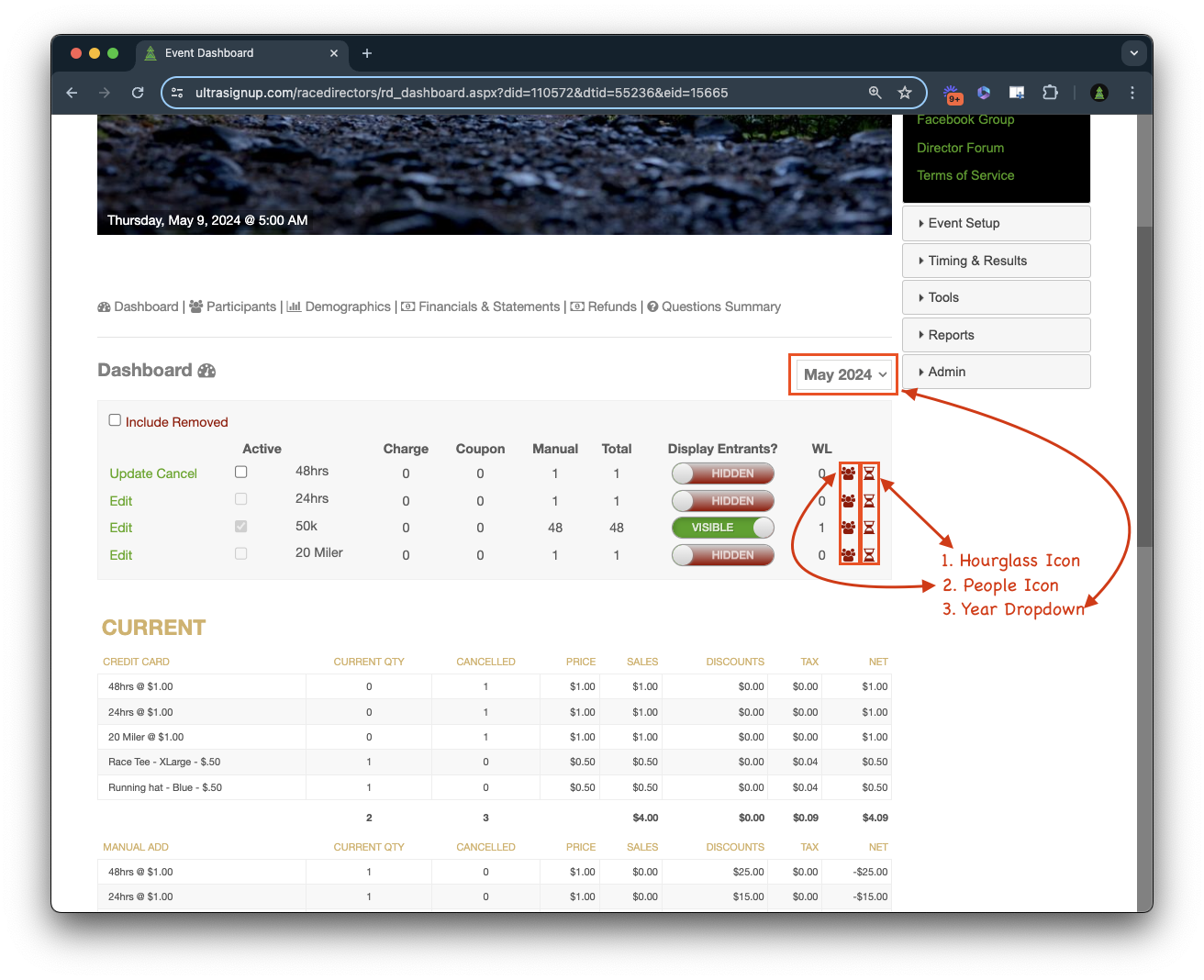Other Useful Links on the Dashboard: Hourglass Icon(1): If your waitlist is hidden, click this icon to easily view your waitlist. People Icon(2): The people icon is quite simply a quick link to your entrant lists. Year Dropdown(3): Use this dropdown to select and view registration data from previous years.