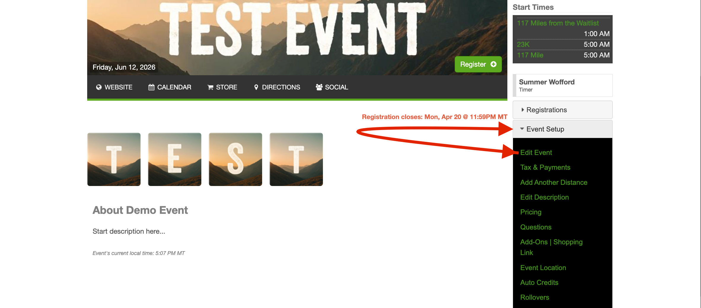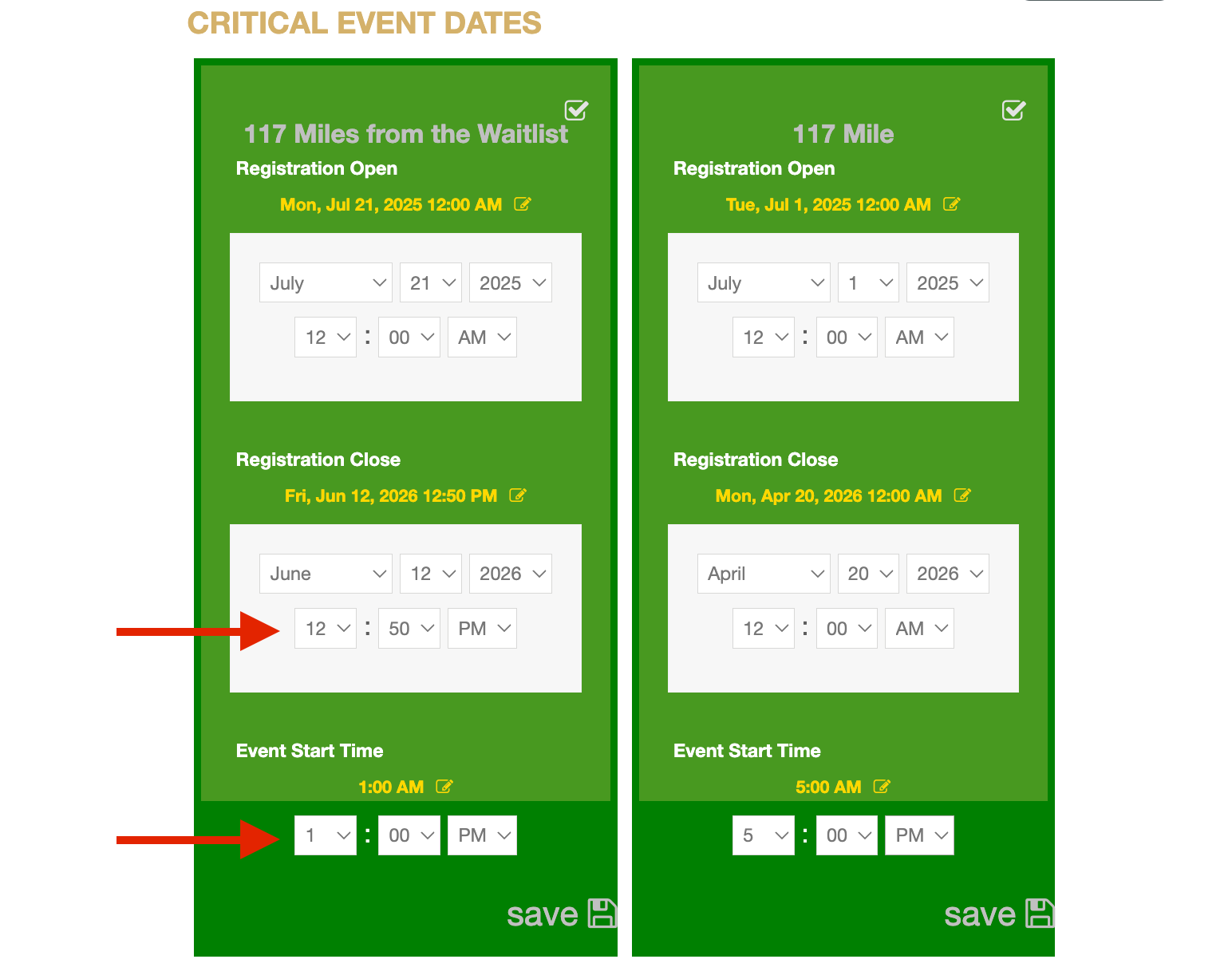 Example: If your race starts Saturday, September 6th at 8:00 AM and you want to allow registration until race start, set your registration closed time to September 6th at 7:50 AM.