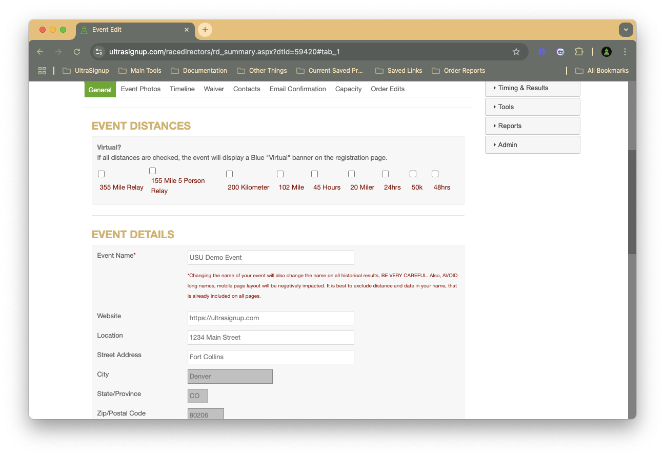 - Change your event name: Please note that changing the name of your event will also update the name on all historical results. Exercise caution when making this change. Additionally, it is advisable to avoid using long names as they can negatively impact the mobile page layout. It's best to exclude distance and date from the event name, as this information is already included on all pages.